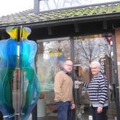 Na veel praten met ons en de opdrachtgever is Lia Koster momenteel in de weer met een imposant glasobject. In haar veel te grote las pak herken je de frêle dame nauwelijks. Nu de basis constructie terug is van de verzinkerij en de poedercoating aangebracht, ligt het beeld in drie stukken in haar atelier. De definitieve glaskleuren zijn inmiddels bepaald en het glas wordt nauwkeurig gesneden. De ruitjes, die allemaal verschillend van vorm en grootte zijn, worden volgens de eeuwenoude glas-in-lood methode met veel geduld aangebracht in het stalen frame. Het zal nog wel een paar maandjes duren voordat we het beeld in een mooie tuin in Naaldwijk gaan plaatsen maar het wordt fantaaaaastisch!